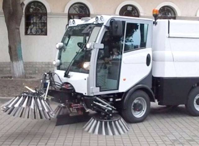 Три фронтальные тарельчатые щётки, диаметром 800 мм, скорость вращения 120 об/мин.